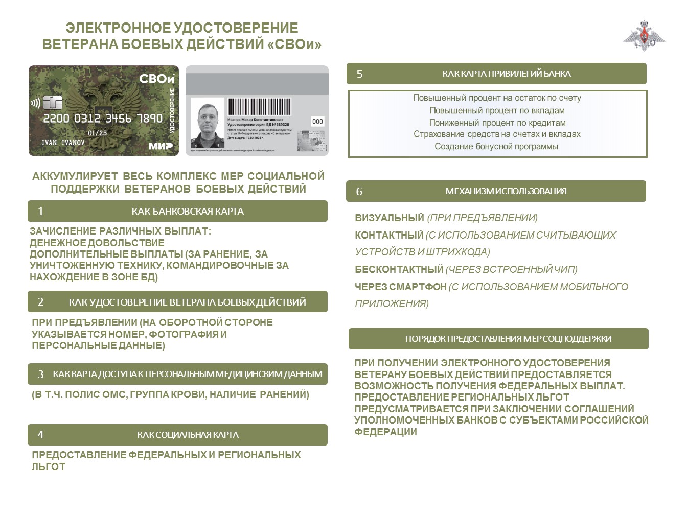 Электронное удостоверение в виде пластиковой карты представляет собой единый носитель информации, объединяющий в себе функции удостоверения ветерана боевых действий (на бумажном бланке), социальной и банковской карты, аккумулирует в себе весь комплекс мер социальной поддержки ветеранов боевых действий. Оно позволит в беззаявительном порядке получать выплаты по линии Минобороны России, федеральные и региональные выплаты, специальные привилегии банка и скидки его партнеров.