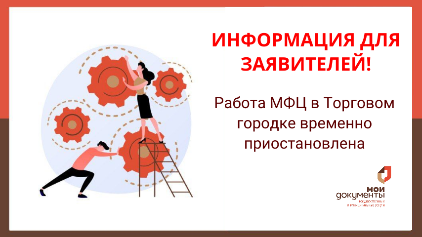Уважаемые заявители! По техническим причинам работа центра «Мои Документы» в городе Рязани в Торговом городке, 15 временно приостановлена.