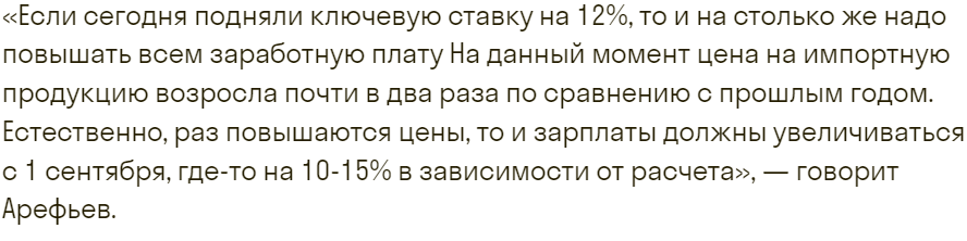 Что касается повышения зарплат, то он считает необходимым действовать «на опережение», как это сделал Центробанк РФ, увеличивший ключевую ставку до 12%.