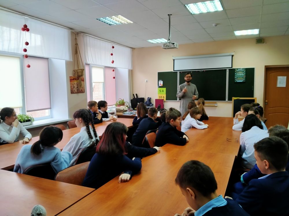 Беседу со школьниками провёл священник Павел Коньков, который рассказал о святых русских воинам, отдавших жизнь за Русь Великую, Русь православную. О преподобном Сергии Радонежском, который дал Дмитрию Донскому судьбоносное благословение на Куликовскую битву, положившей начало освобождению Руси от ордынского ига. История о подвиге монахов-воинов Ослябя и Пересвета вызвала особый интерес у ребят.
