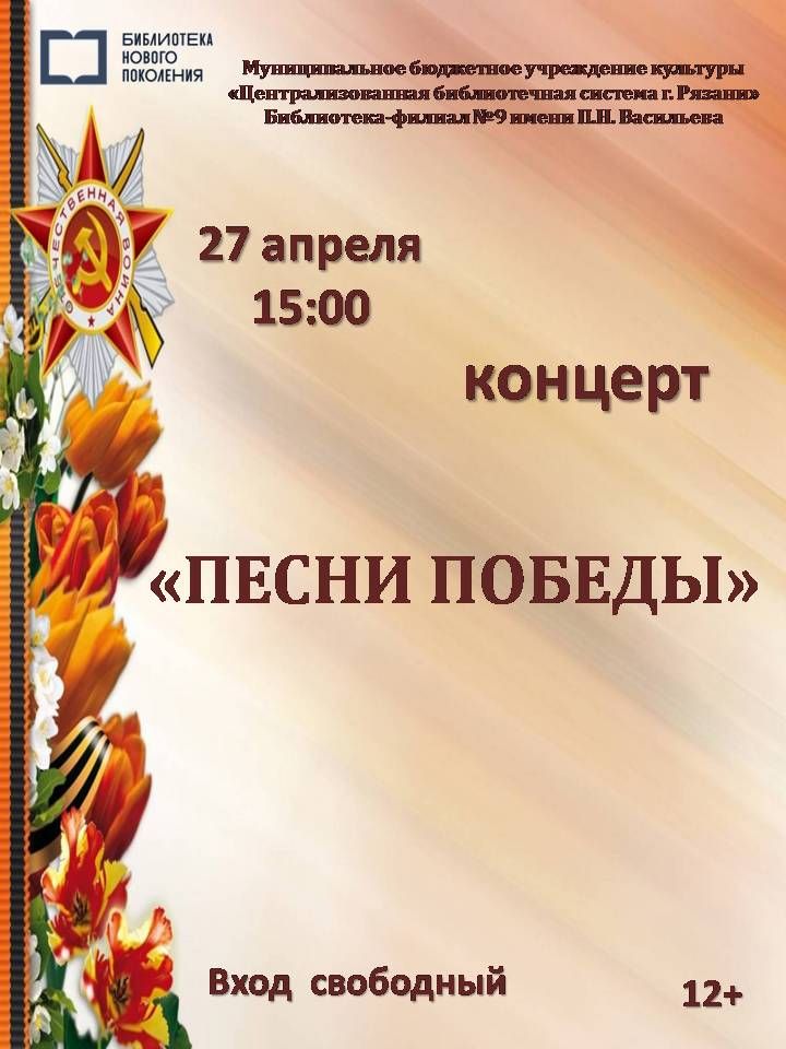27 апреля в 15:00 библиотека-филиал № 9 имени П. Н. Васильева приглашает на праздничный концерт «Песни Победы». Об этом сообщает ЦБС Рязани.