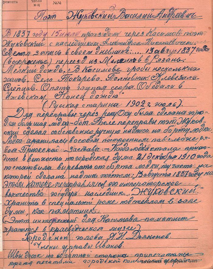 Из записей в его дневнике: «13 августа 1837 года (воскресенье) переезд из Меленок в Рязань. Мелкий дождь. В Касимове гробы нескольких ханов. Село Токарево. Полковник Клевезаль – Слепцов. Опять глупая ссора. Обедали в Ижевском». Для переправы через реку Оку городом была сделана большая лодка, на которой переправлялись поэт и наследник цесаревич Александр Николаевич. После переправы Жуковский сделал надпись на борту лодки: «13 августа 1837 году на этом катере переправлялся его императорское высочество государь наследник. Жуковский». Долгое время лодка хранилась в специальном павильоне на ул. Набережная. Потом, спустя время, она стала приходить в негодность, Городская управа приняла решение вырезать от борта лодки ту часть, где была сделана надпись с автографом знаменитого поэта. Эта часть лодки некоторое время хранилась в одном из залов Касимовской Городской управы. Позже было принято решение передать этот «интересный памятник» в Касимовский краеведческий музей, где он до сих пор хранится и экспонируется. Посетив музей, вы сможете увидеть данный экспонат в одном из залов.