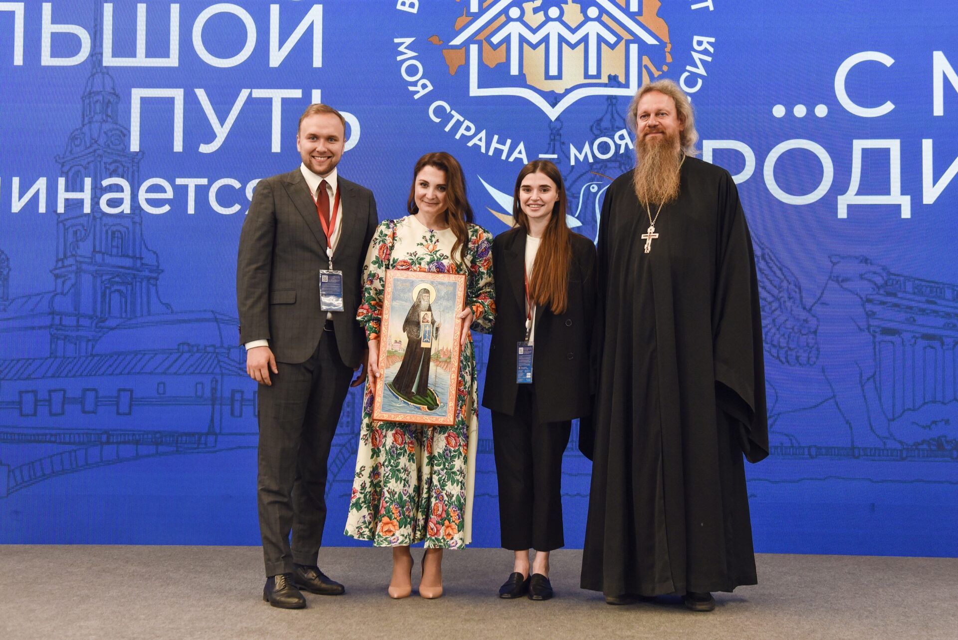 Фото: Настоятель Спасо-Преображенского мужского монастыря игумен Лука (Степанов) передаёт в дар автору и научному руководителю Всероссийского конкурса «Моя страна – моя Россия» Ларисе Сергеевне Пастуховой и дирекции конкурса икону Святителя Василия Рязанского (Петербургский международный экономический форум, г. Санкт-Петербург, 2022 год)