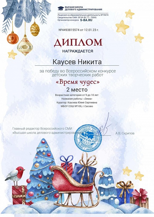 Мы поздравляем учеников школы №106 Каусева Никиту 5А класс, занявшего 2 место в конкурсе , и ученика 2А класса Каусева Данилу, занявшего 1 место в конкурсе. Благодарим воспитателя группы продленного дня Каусеву Ю.С за подготовку участников!