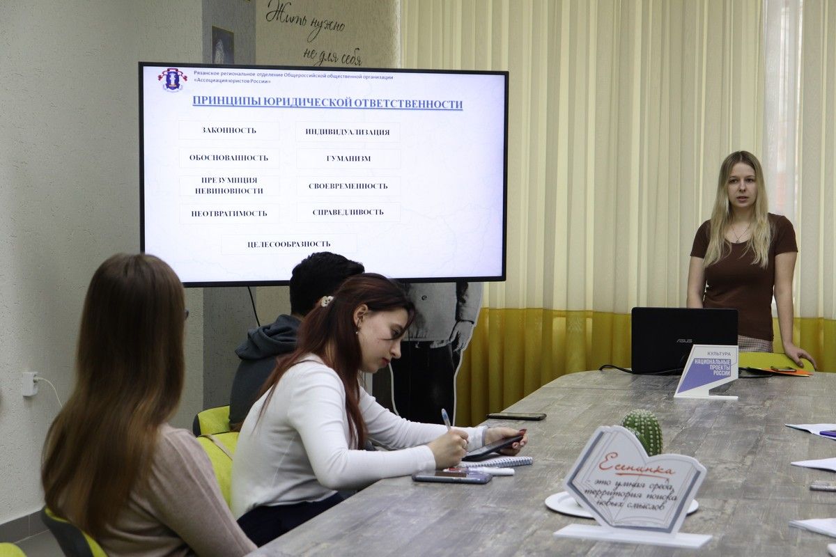 Старший преподаватель юридического института РГУ имени С. А. Есенина Екатерина Юрьевна Кольцова познакомила школьников с понятием «юридическая ответственность», признаками, принципами, видами юридической ответственности. Старшеклассники научились отличать виды административных наказаний от видов уголовных наказаний, узнали о способах защиты гражданских прав. Полученные знания слушатели закрепили на тренировочных заданиях.