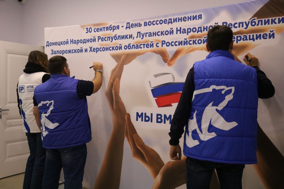 В преддверии Дня воссоединения Донецкой и Луганской республик, Запорожской и Херсонской областей с Российской Федерацией в Штабе общественной поддержки «Единой России» стартовала акция «Год вместе».