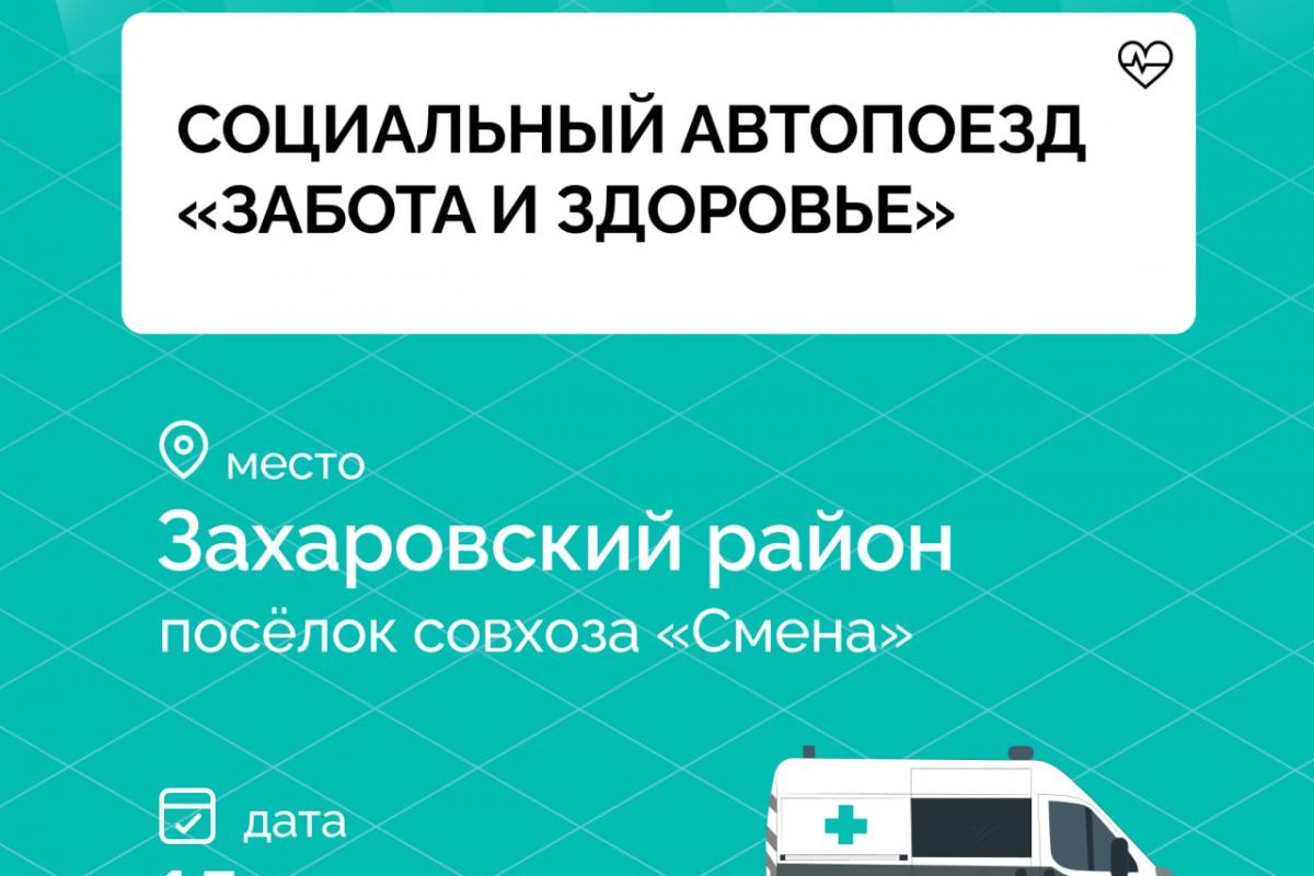 15 августа социальный автопоезд «Забота и здоровье» отправится в поселок совхоза «Смена» Захаровского района.