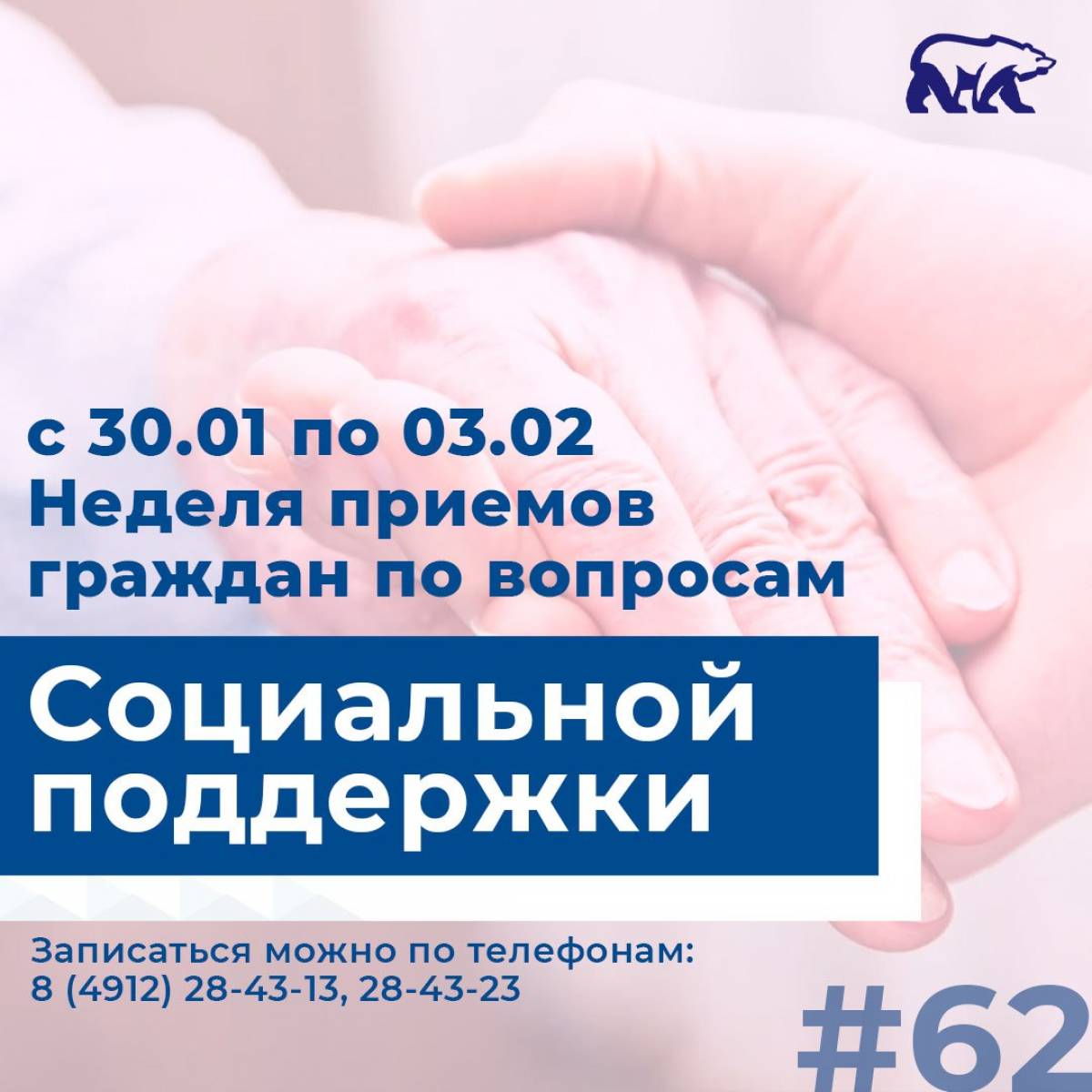 Неделя приемов граждан по вопросам социальной поддержки пройдет с 30 января по 3 февраля в региональной и местных общественных приемных «Единой России». С графиком можно ознакомиться по ссылке .