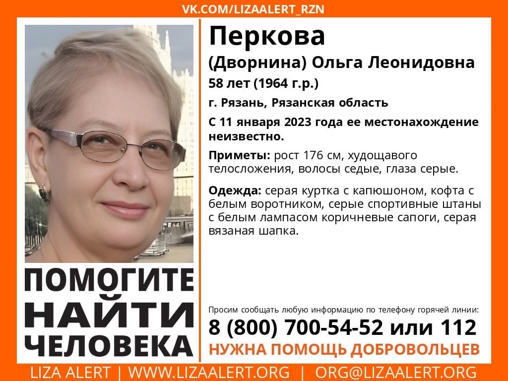 В Рязани пропала 58-летняя #Перкова (Дворнина) Ольга Леонидовна. О начале поисков женщины сообщили волонтёры ПСО «Лиза Алерт».