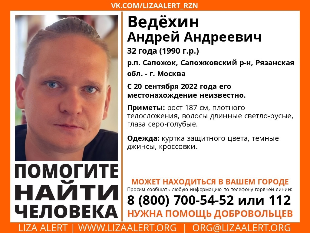 В Рязанской области пропал 32-летний #Ведёхин Андрей Андреевич. Об этом сообщает официальная страница поисково-спасательного отряда «Лиза Алерт».