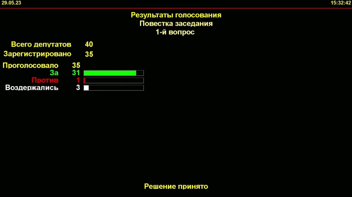 Решение было поддержано большинством депутатов (31), трое воздержались, а один проголосовал против.