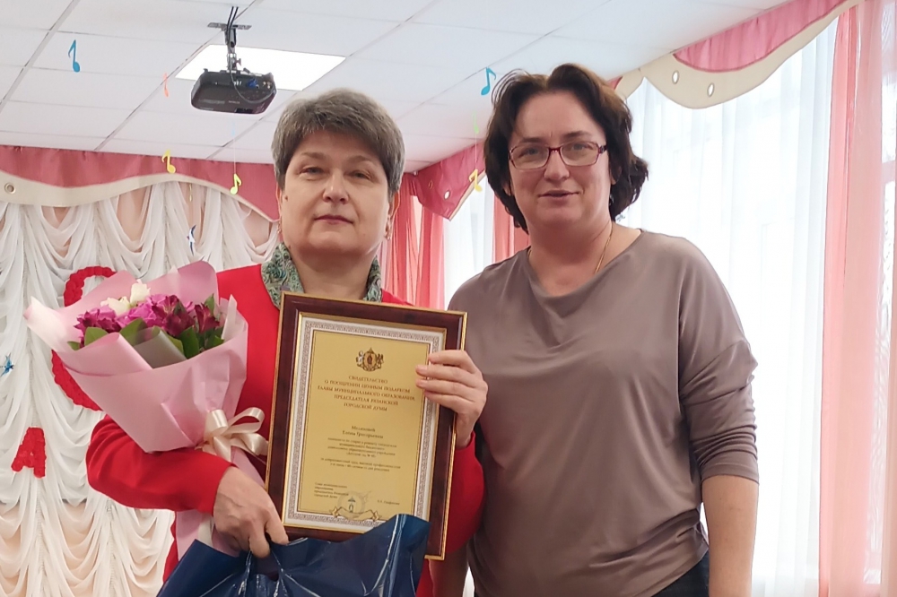 Кроме того, Елена Волкова поздравила с юбилеем и вручила муниципальную награду сотруднику этого дошкольного учреждения Елене Мелеховой.