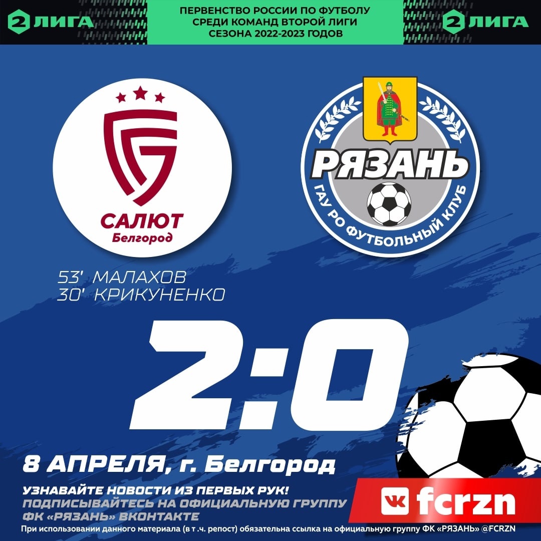 В субботу, 8 апреля, футбольный клуб «Рязань» провёл очередной матч первенства России среди команд Второй лиги. На выезде рязанцы встречались с ФК «Салют Белгород» и уступили — 0:2.