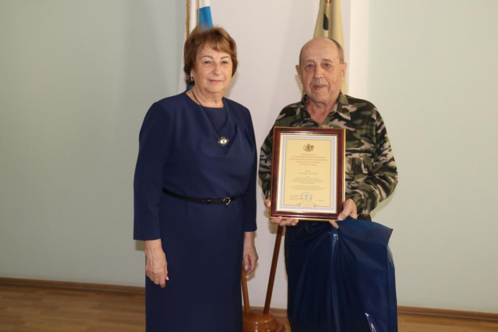 В связи с 74-ой годовщиной со дня первого испытания атомной бомбы на Семипалатинском полигоне первый заместитель главы муниципального образования Лариса Максимова вручила памятные подарки Рязанской городской Думы членам регионального отделения ГОО «Комитет ветеранов подразделений особого риска РФ» Александру Рыбину и Виктору Пиюку.