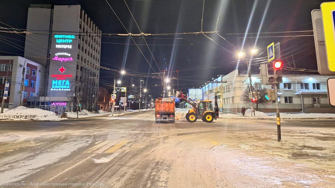 Спецтехника работала на улицах Есенина на участке от улицы Грибоедова до улицы Щедрина по одной стороне, Солотчинское шоссе на участке от ТРЦ «Круиз» до улицы Грибоедова – одна сторона, Есенина, Горького, Сенная в районе центрального входа в сквер им. В.Ф. Маргелова, Семинарская, Ленина на парковке у ТЦ «Аркада», проезд Яблочкова в районе отеля «Форум», Зубковой на участке от «Фортуны» до остановки «Ледовый дворец», Советской Армии на участке от улицы Зубковой до улицы Новоселов – дублеры по двум сторонам, Дзержинского – парковочные карманы, Ленина на участке от улицы Соборной до улицы Почтовой по одной стороне, Грибоедова – остановки, парковочные карманы, Княжье поле (участок – 350 м), проезд Шабулина на участке от остановки «Завод «Красное Знамя» до остановки «Депо №2», Павлова на участке от Первомайского проспекта до улицы Кудрявцева, Первомайский проспект на участке от улицы Вокзальной до площади Победы, Соколовская, дороге на ЗИЛ, поселке Агропром, Связи, Прудная, Новоселковская, Восточный Промузел.