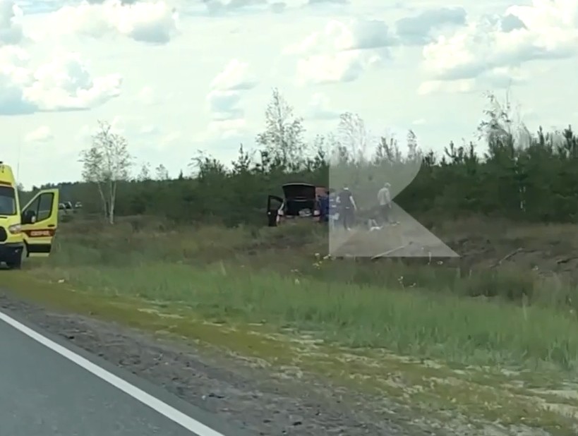 ДТП случилось между Кельцами и Передельцами. Легковой автомобиль вылетел с дороги. На месте находится скорая помощь, у машины лежит человек.