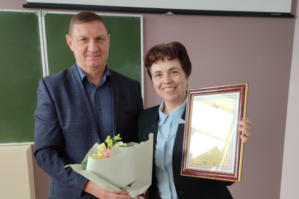 Сергей Еремин вручил Ирине Пахомовой благодарность главы муниципального образования, председателя РГД за многолетний безупречный труд, большой вклад в дело обучения и воспитания подрастающего поколения и в связи с юбилеем.