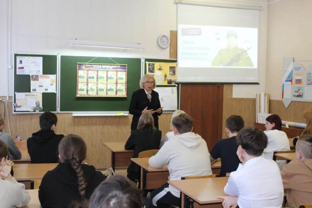 Глава муниципального образования, председатель Рязанской городской Думы Татьяна Панфилова побывала в школе №28 на торжественной линейке и на внеурочном занятии «Разговоры о важном». Тема встречи – День защитника Отечества. С восьмиклассниками школы обсудили вопросы присвоения Рязани звания «Город трудовой доблести», вспомнили знаменитых рязанцев, в разные годы стоявших на страже безопасности нашего города и его жителей, поговорили о героях Великой Отечественной войны, подвиге воинов-интернационалистов и тех, кто сейчас выполняет задачи в ходе специальной военной операции.