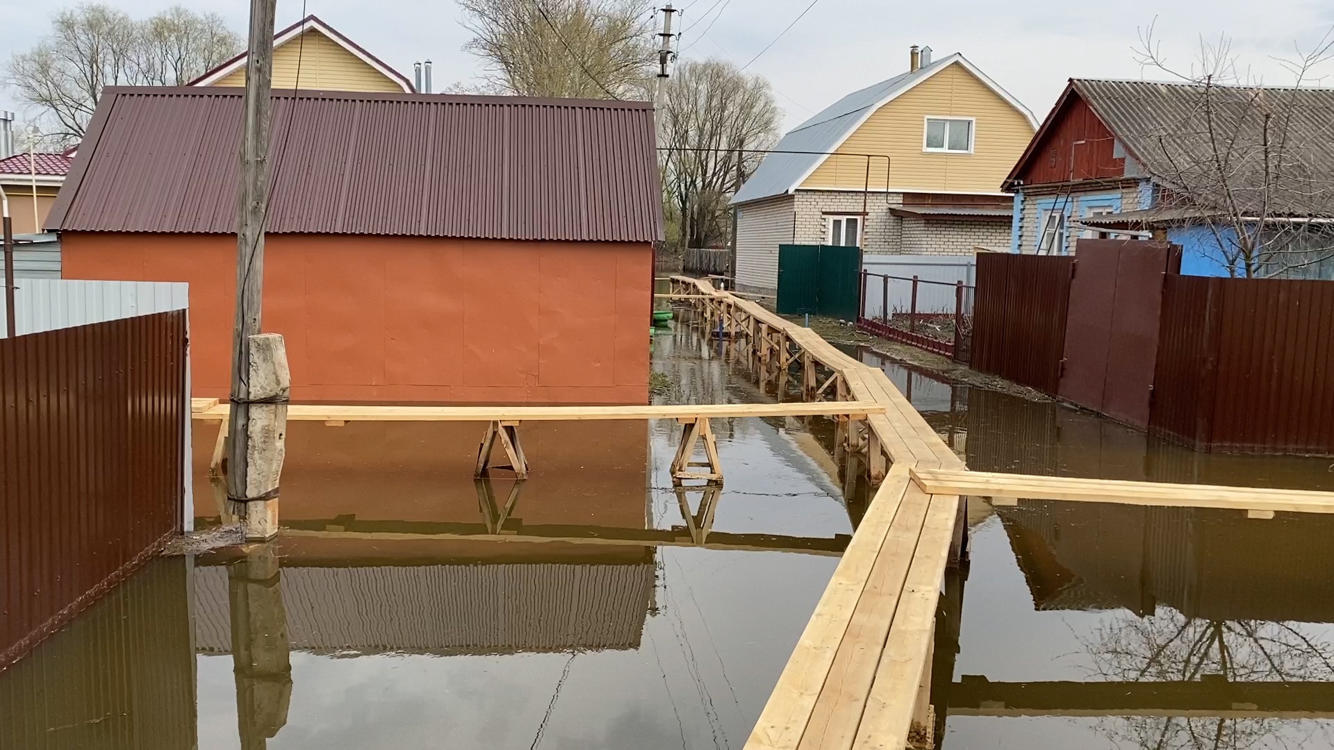 Передвигаться по поселку можно без резиновых сапог. Аварийно-спасательная служба отдела ГО И ЧС администрации Рязани и Дирекция благоустройства продолжают сооружать деревянные настилы рядом с домами, где вода зашла на приусадебные территории. И делают их с запасом, на случай, если разлив продолжится. Но, судя по всему, вода отступает.