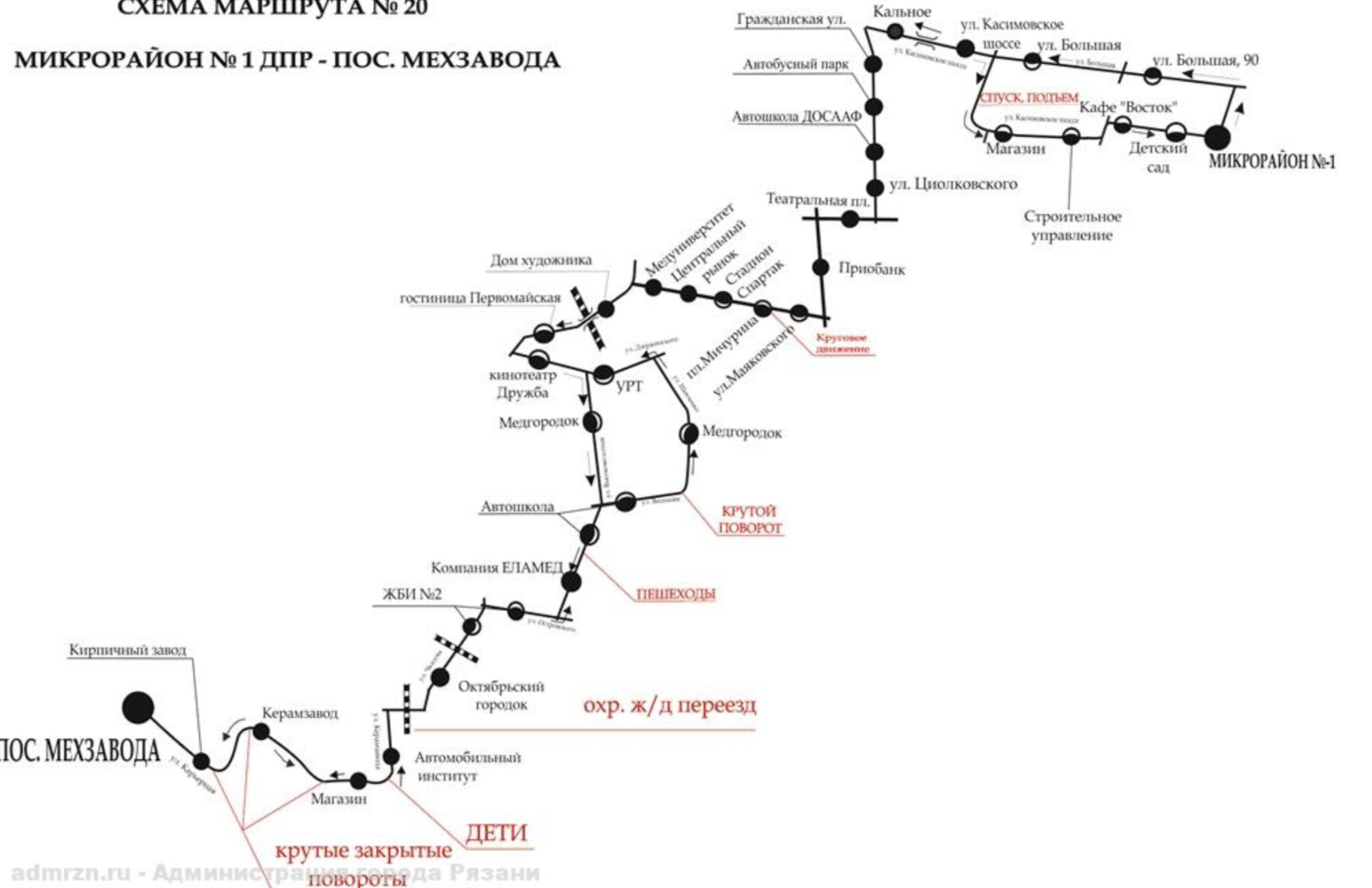 Пассажиры, которым необходимо проследовать в направлении центра города, смогут пересесть на следующий из центра автобус №20 на остановках «Магазин (Касимовское шоссе)», «Строительное управление», «Кафе Восток» и «Детский сад» и по купленному билету осуществить бесплатно пересадку на конечной остановке «Микрорайон №1» в другой автобус маршрута №20 либо продолжить поездку на этом же автобусе.