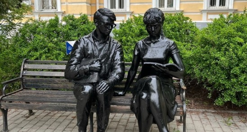 В Рязани памятник Шурику и Лидочке у здания РГУ перекрасили в чёрный цвет
