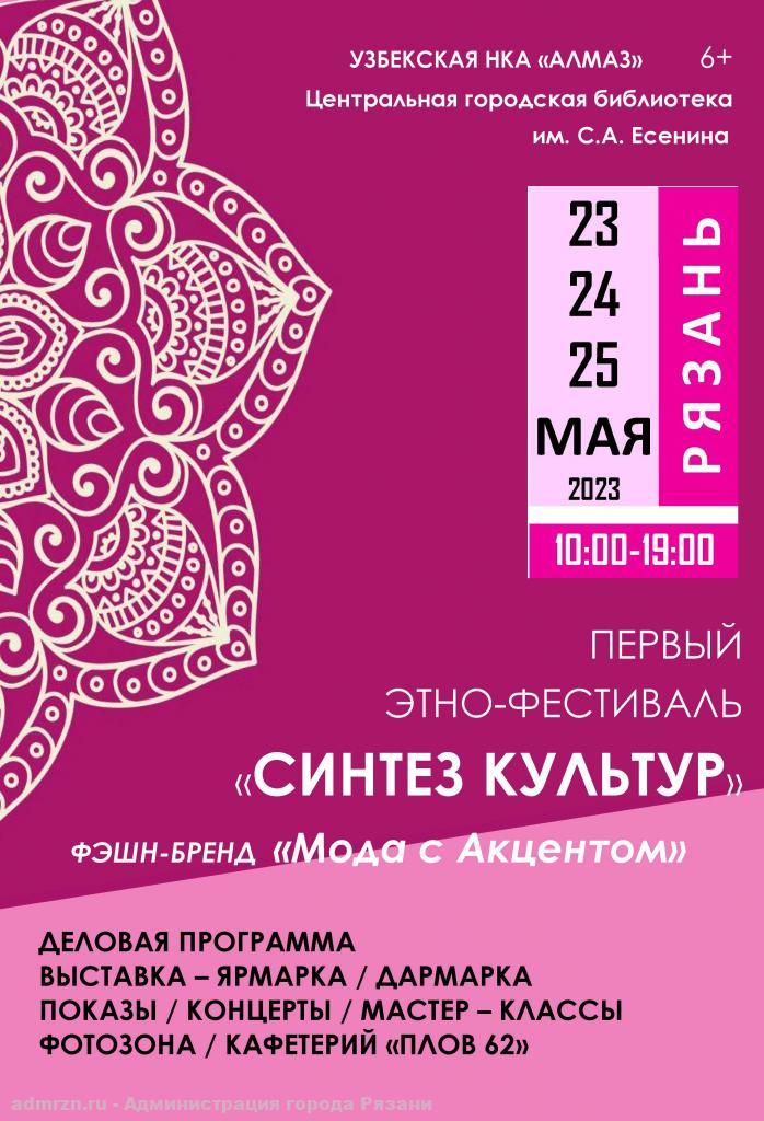23-25 мая в Центральной городской библиотеке им. С. А. Есенина в Рязани состоится Первый городской открытый фестиваль этнической культуры «Синтез культур», организованный узбекской НКА «Алмаз».
