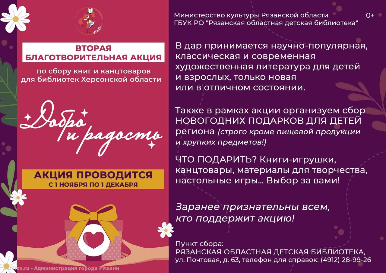 Сбор книг на русском языке объявлен Рязанской областной детской библиотекой по поручению регионального министерства культуры. В ходе первой акции для библиотек Херсонской области были собраны и переданы около 4000 книг и 24 коробки с канцтоварами.