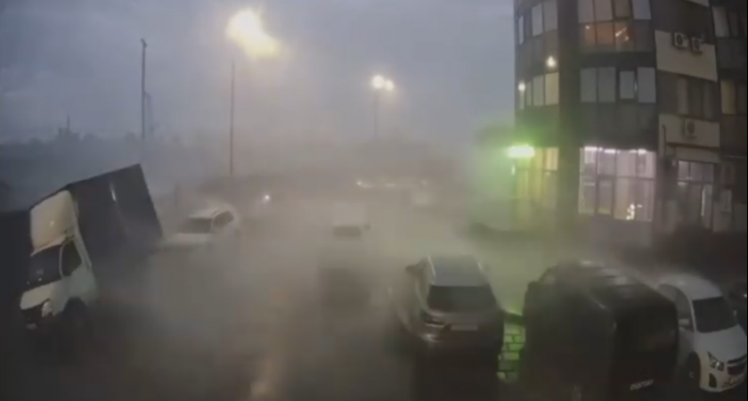 На фрагменте видео, сделанного около 21 часа вечера в пятницу, 5 июля, можно наблюдать, как ветер расшатывает транспортное средство и опрокидывает ее.