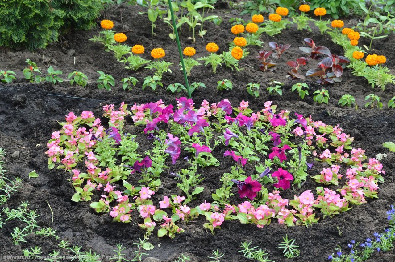 Всего сегодня было высажено 14000 растений, в том числе, бегония, агератум, цинерария, тагетес, лобелия, астра, портулак, петуния, пеларгония, колеус, сальвия, циния. Оформлено две клумбы общей площадью 320 кв. метров. Кроме того, на клумбах уже растут многолетние цветы, которые также вписаны в общий рисунок. Непосредственной посадке цветов предшествовала большая работа по созданию схемы будущей клумбы, подбора растений, планировки земельного участка и разметки на нем геометрических рисунков.