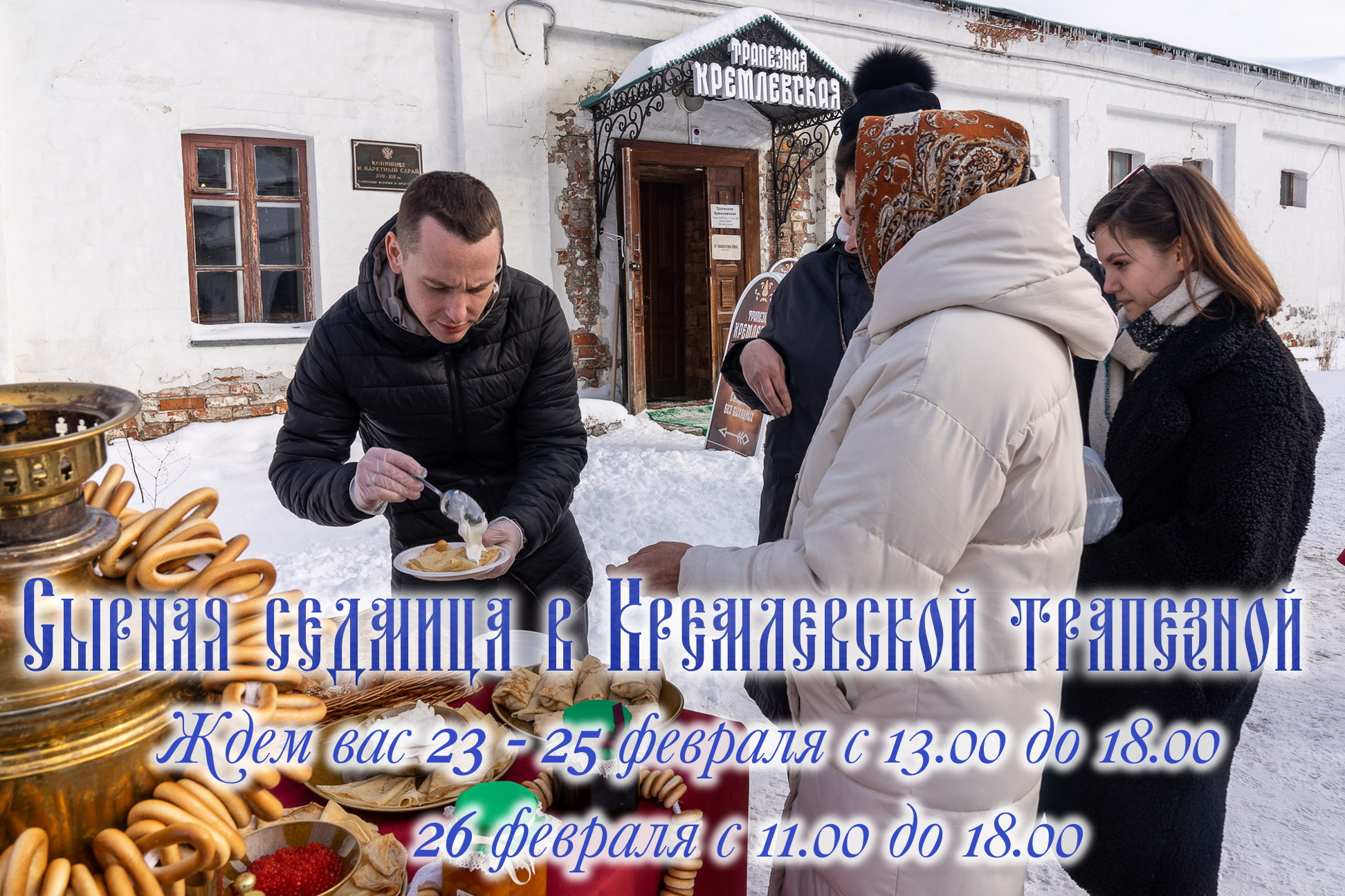 В дни Сырной седмицы, с 23 по 26 февраля, около «Кремлевской трапезной» можно будет попробовать традиционное народное угощение этой недели – блины, а также пирожки и другие изделия из теста, блюда на мангале, и согреться ароматным горячим чаем из самовара.