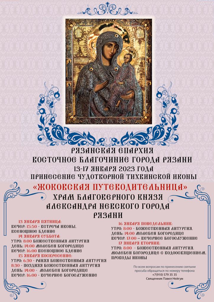 Тихвинская икона Божией Матери из храма села Большое Жоково будет принесена в Александро-Невский храм Рязани. 13 января в 15.50 состоится встреча святыни, ее пребывание в храме продлится до вторника, 17 января. В 8.00 будет совершена Божественная литургия и затем молебен, после чего пройдут проводы образа.
