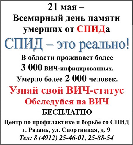 По любым интересующим вопросам можно обратиться в Центр по профилактике и борьбе со СПИД и ИЗпо адресу: г. Рязань, ул. Спортивная, д.9 . Телефон: 8 (4912) 25-46-01 , https://rspid.medgis.ru .