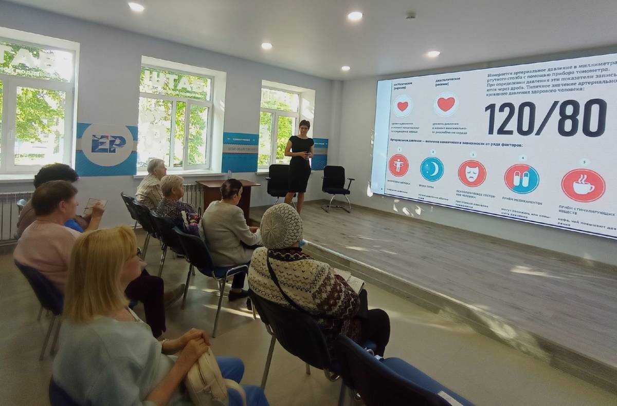 Говорили о факторах, провоцирующих подъем артериального давления, его клинических проявлениях, последствиях гипертонии и современных подходах к ее терапии. Также речи шла о принципах здорового питания для гипертоников и физической активности. Доктор подробно объяснила, как правильно мерить давление, чтобы его показатели не были искажены. Все участники встречи получили исчерпывающие ответы на свои вопросы.