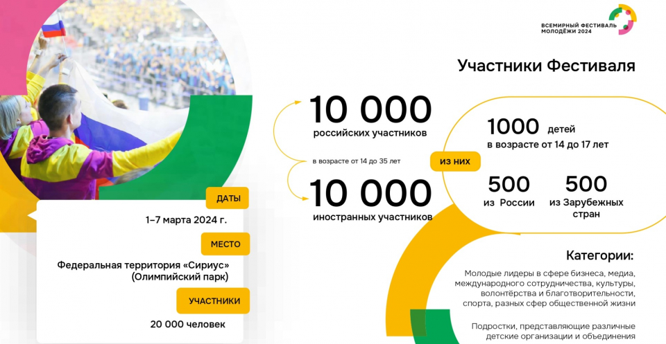 В соответствии с Указом Президента РФ В. В. Путина с 1 по 7 марта 2024 года на федеральной территории «Сириус» состоится Всемирный фестиваль молодёжи.