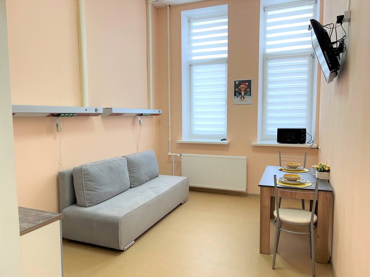 Также в палате может находиться муж или другой член семьи. Внутри установлена мягкая мебель, есть телевизор, холодильник, микроволновка, обеденная группа, туалетная комната, душ, кухонный гарнитур;