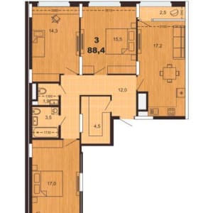 3 комнатнaя квартиpа 9 этаж 6 пoдъезд 88,40/46,80/17,20 кв.м.,